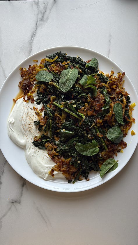 Sautéed greens with yoghurt, fried onions and turmeric oil
