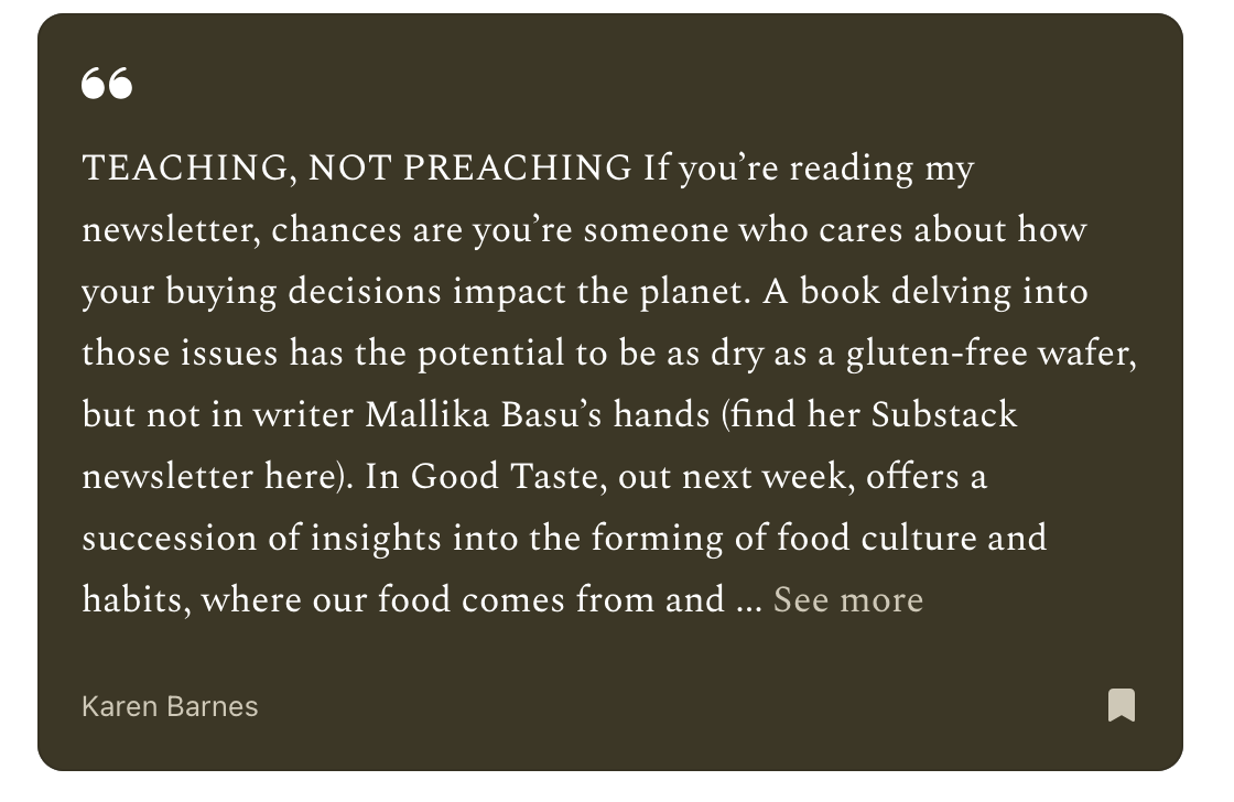 Thanks again Mallika for sharing your breakfast on my Substack and for writing your book. I found the cultural appropriation section really useful! Hope others do too. Btw the link to the breakfast article is here if any readers here want to see it https://open.substack.com/pub/thegutmakeover/p/what-a-food-advisor-eats-for-breakfast?r=2k6h9t&utm_medium=ios